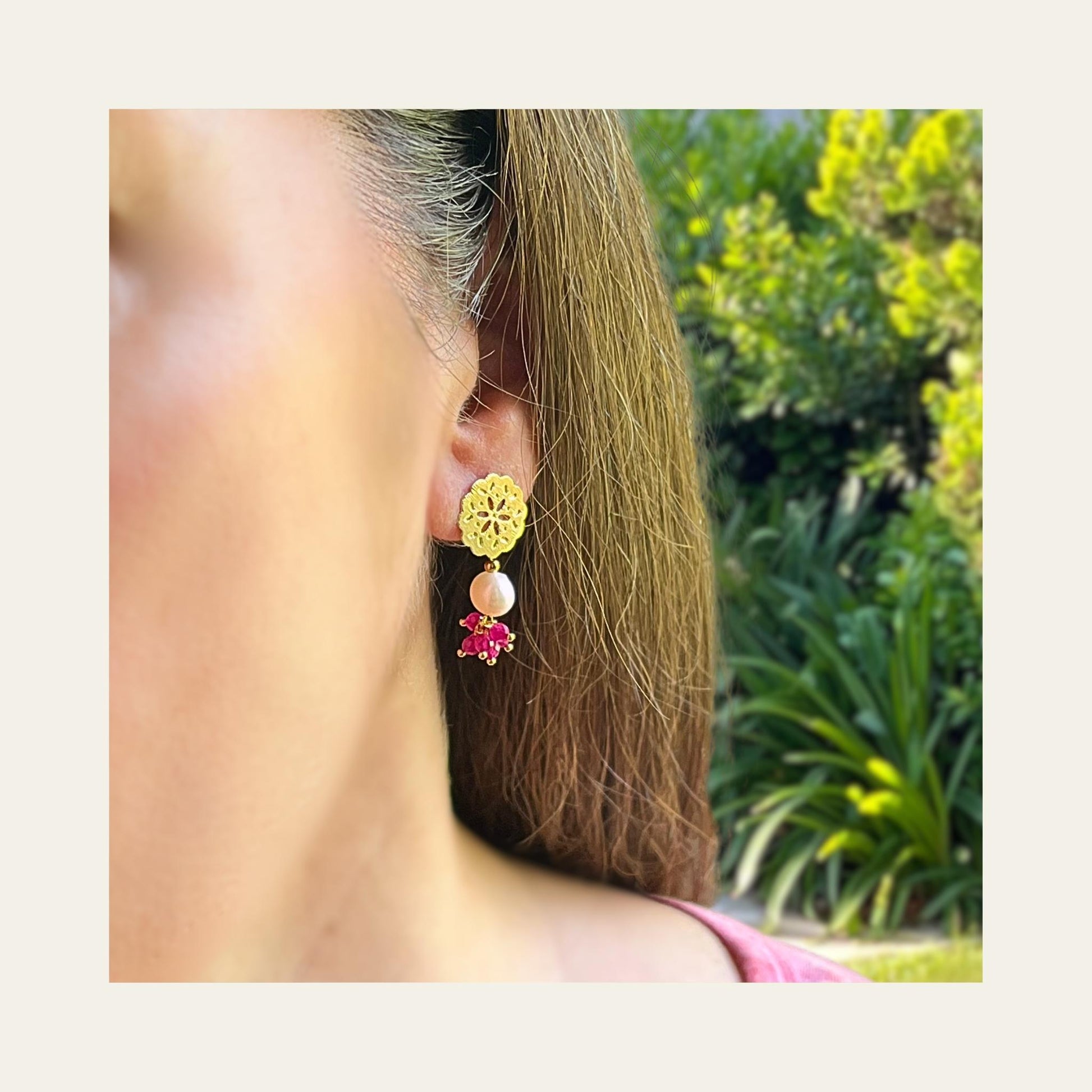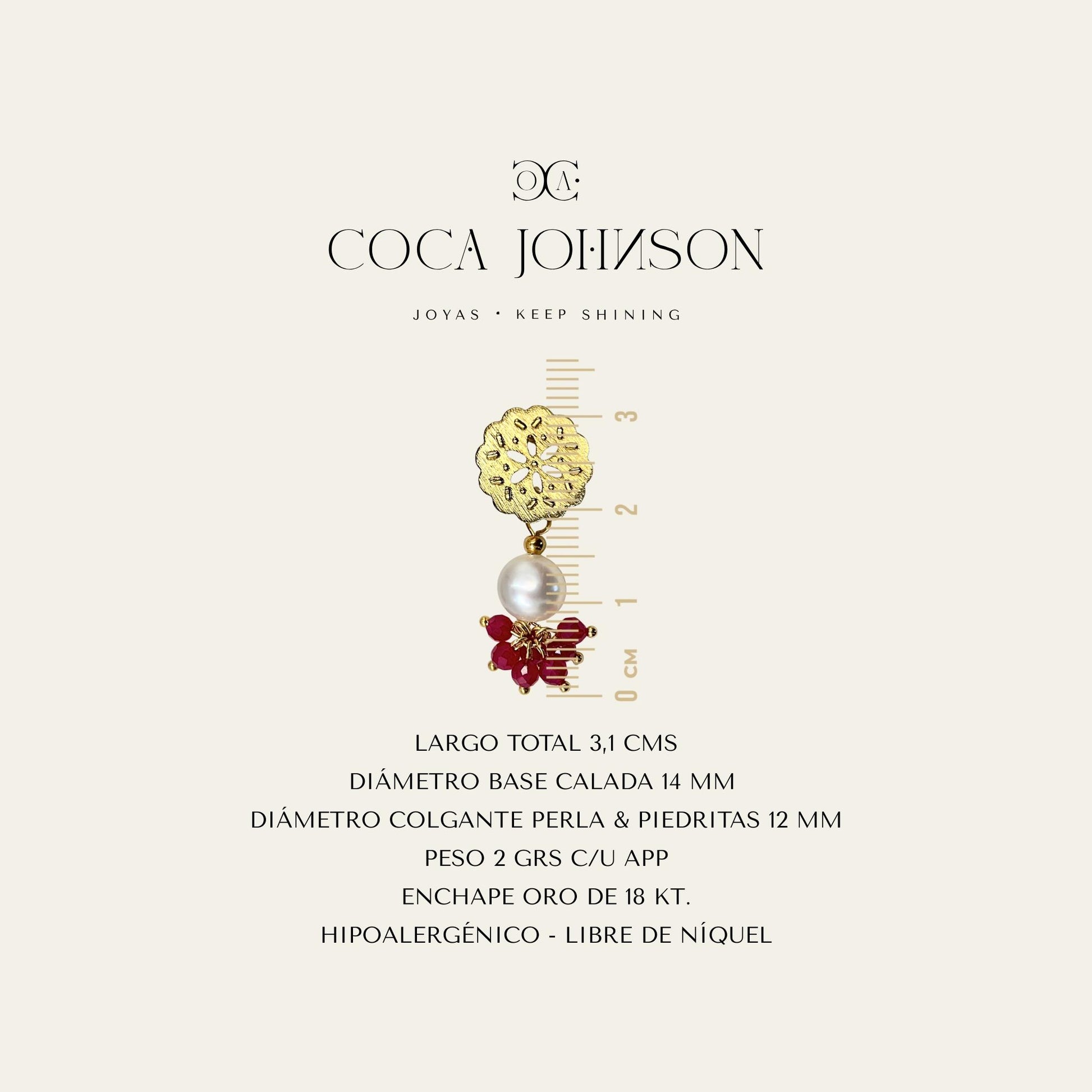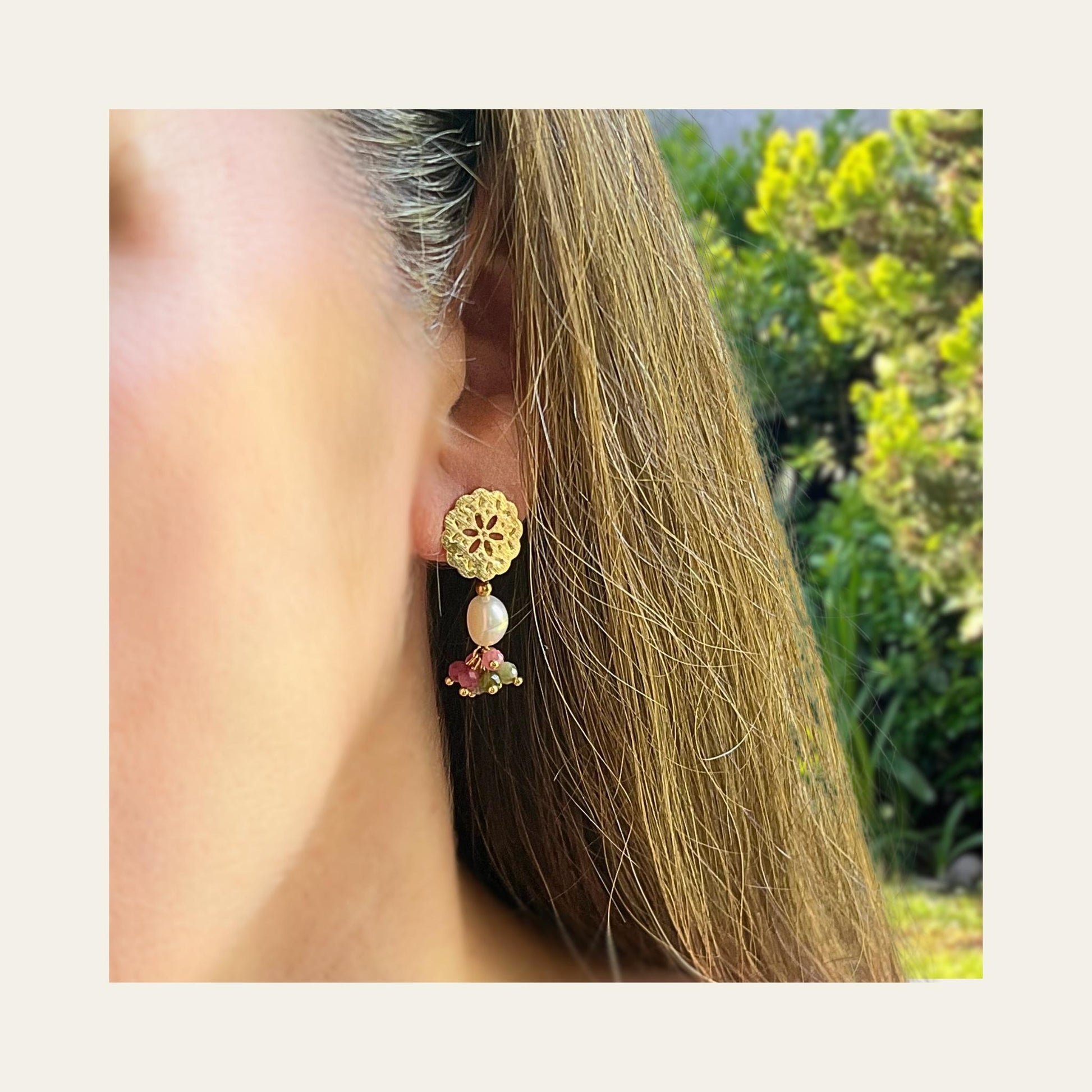 - Aros enchapados en oro de 18 kt. con diseño de flor calada, perla de río y una delicada caída de piedras naturales; circón blanco, corindón rojo o turmalina.