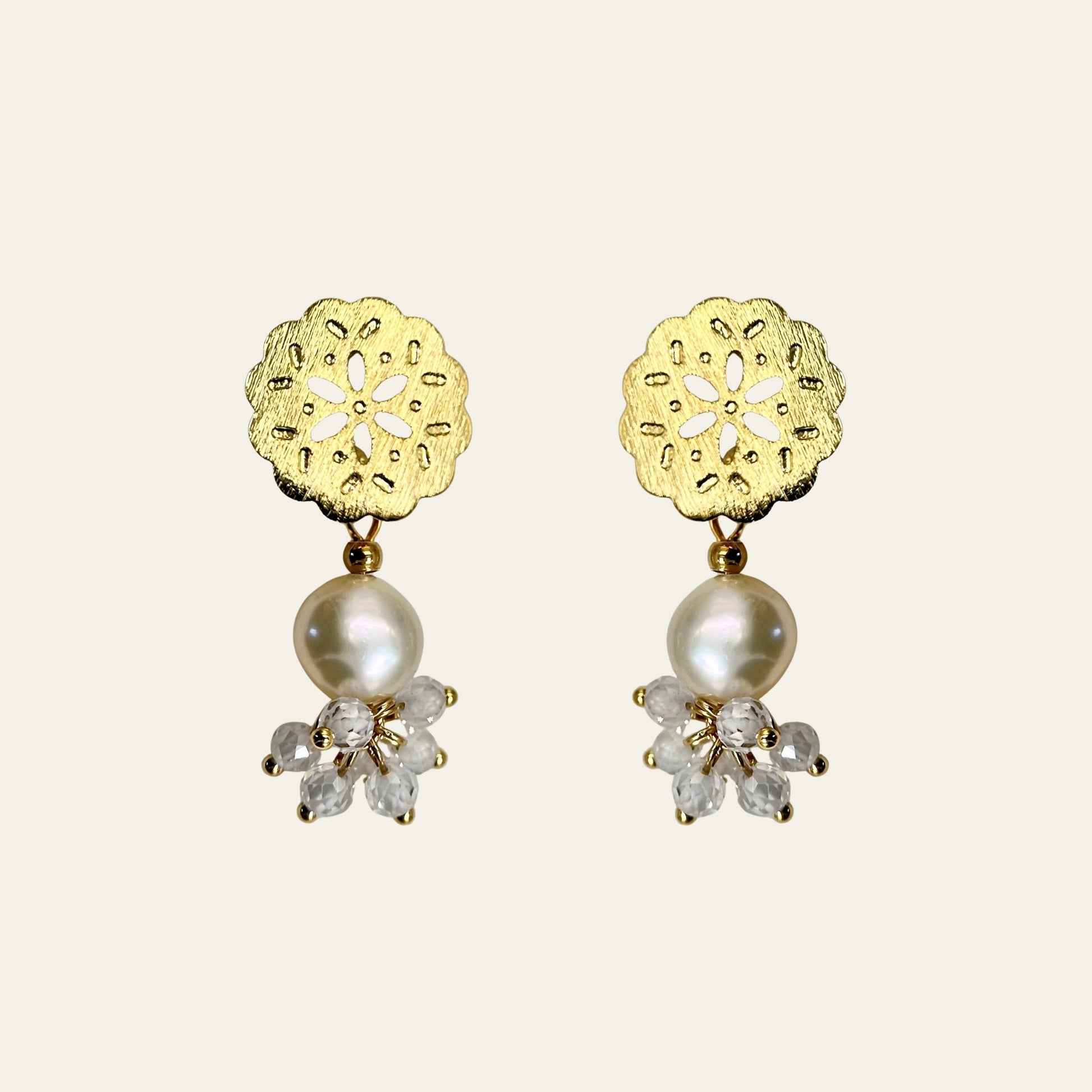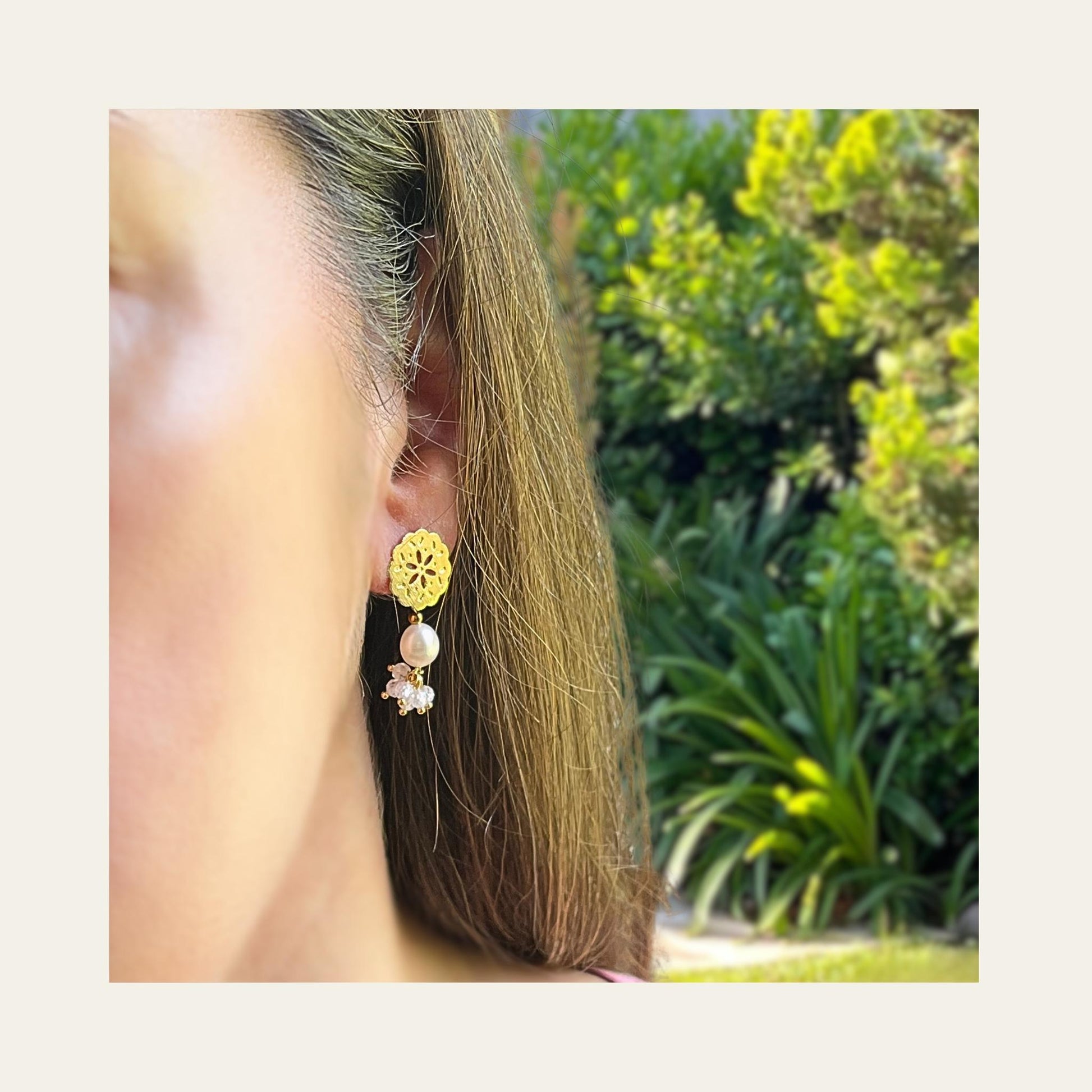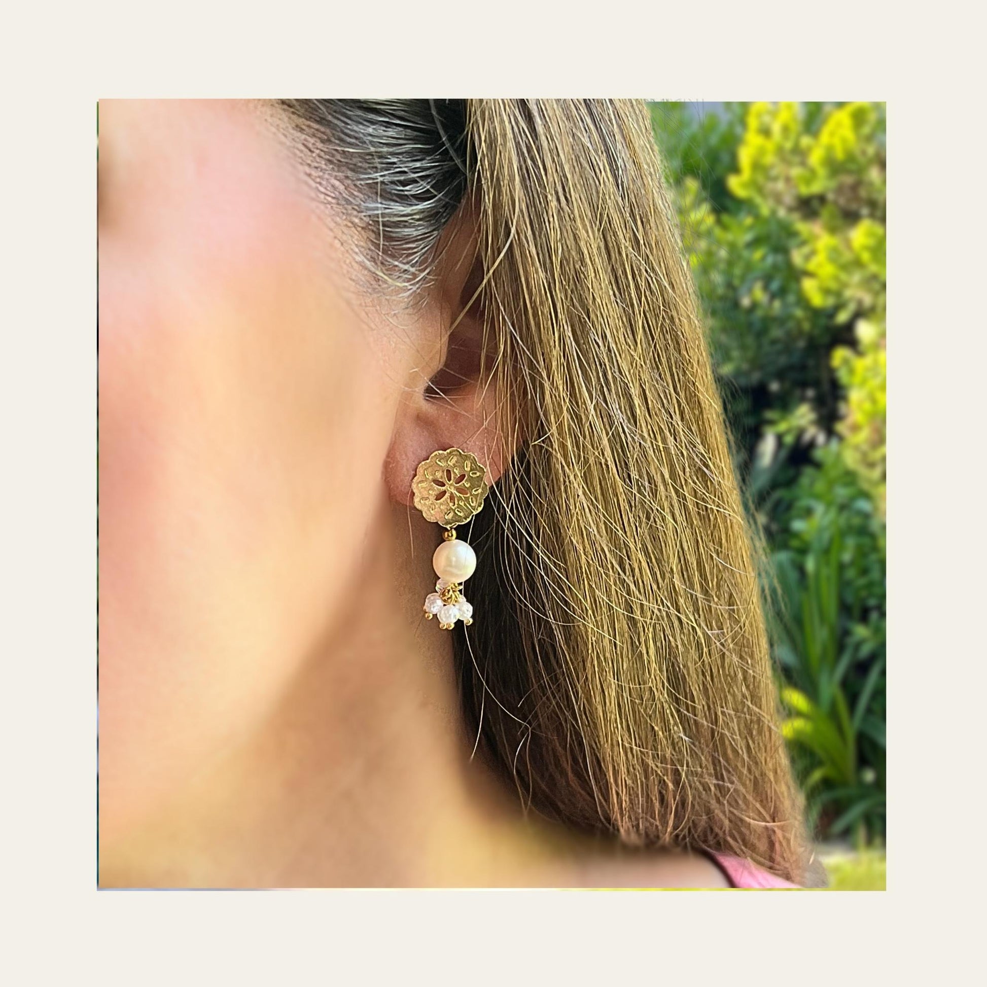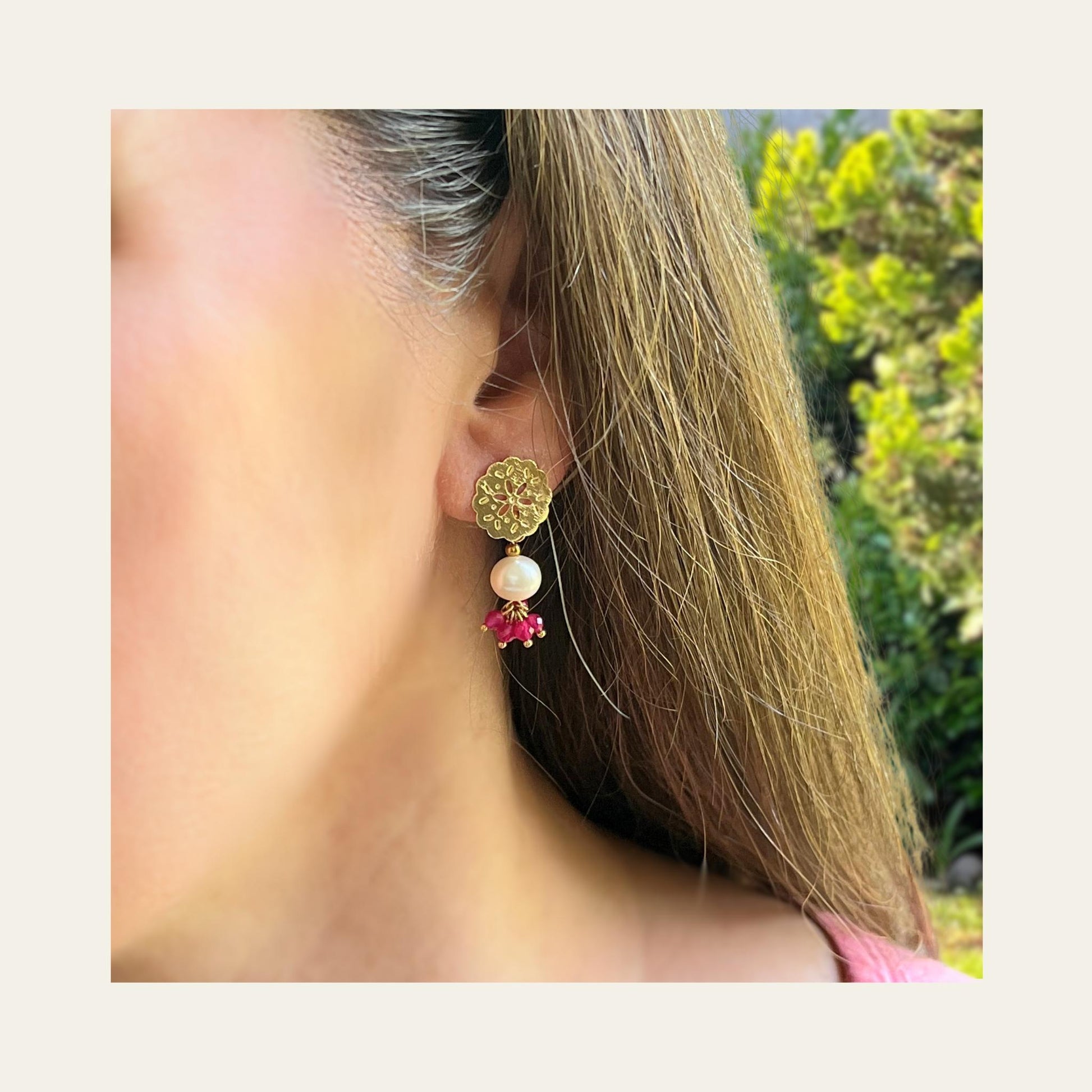 - Aros enchapados en oro de 18 kt. con diseño de flor calada, perla de río y una delicada caída de piedras naturales; circón blanco, corindón rojo o turmalina.