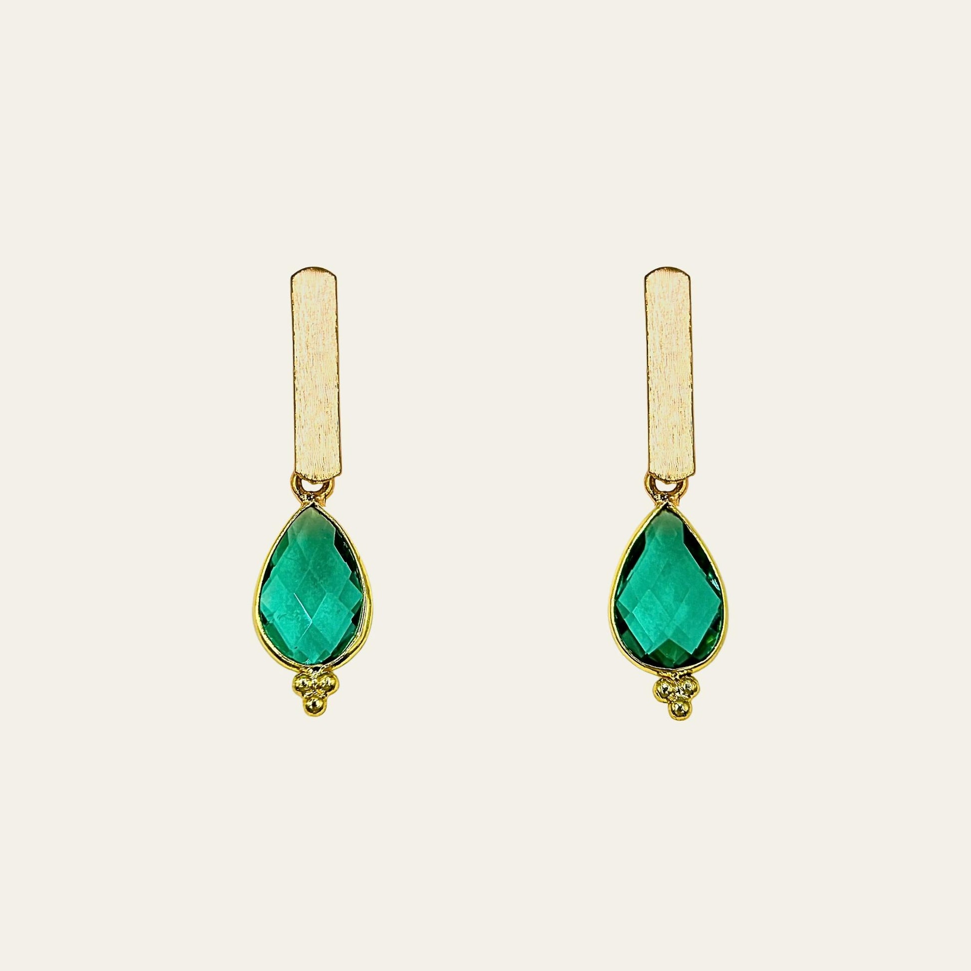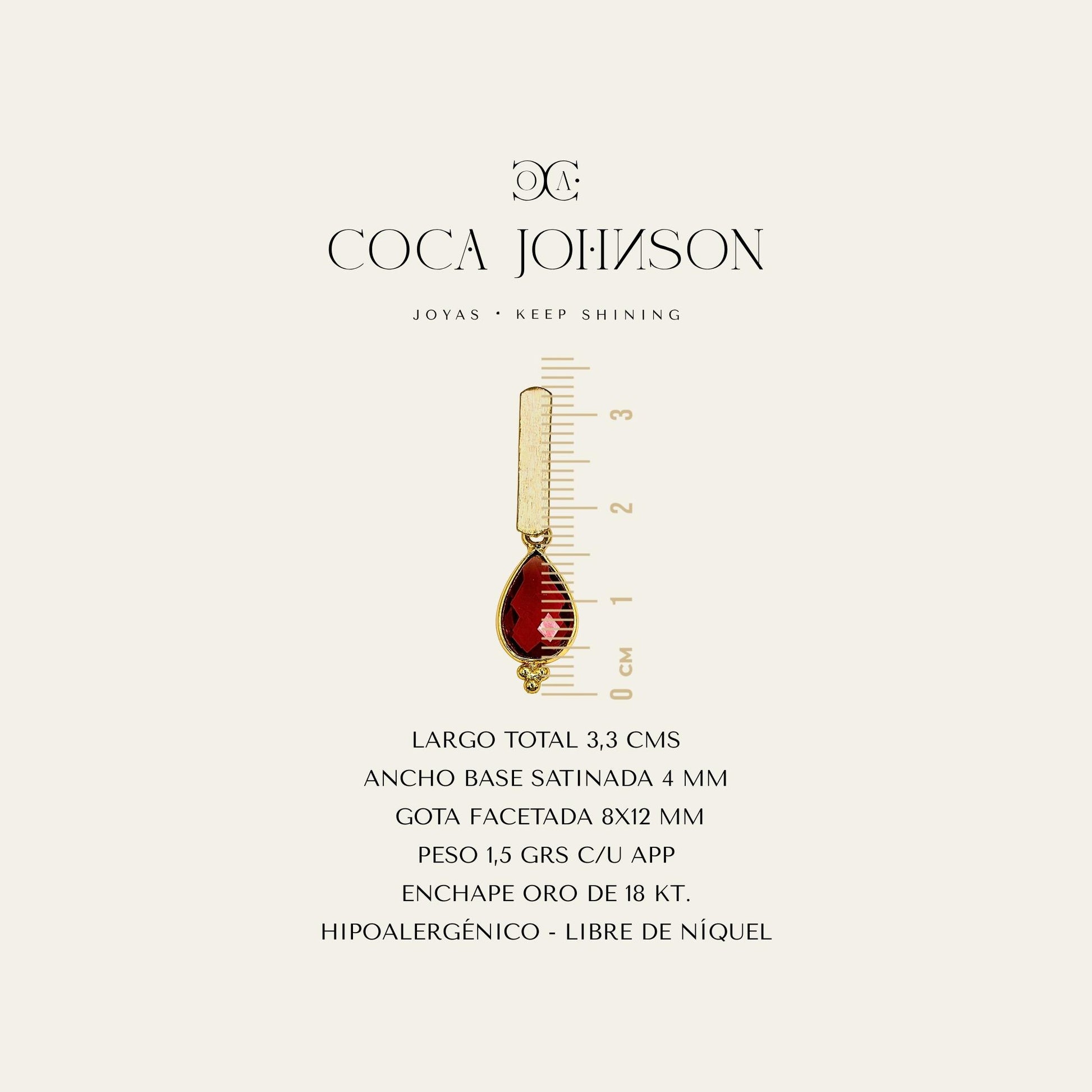 - Aros enchapados en oro de 18 kt. con una gota facetada de 8x12 mm, disponible en un intenso verde esmeralda o en rojo granate, aportan un toque de color y sofisticación a tu outfit.