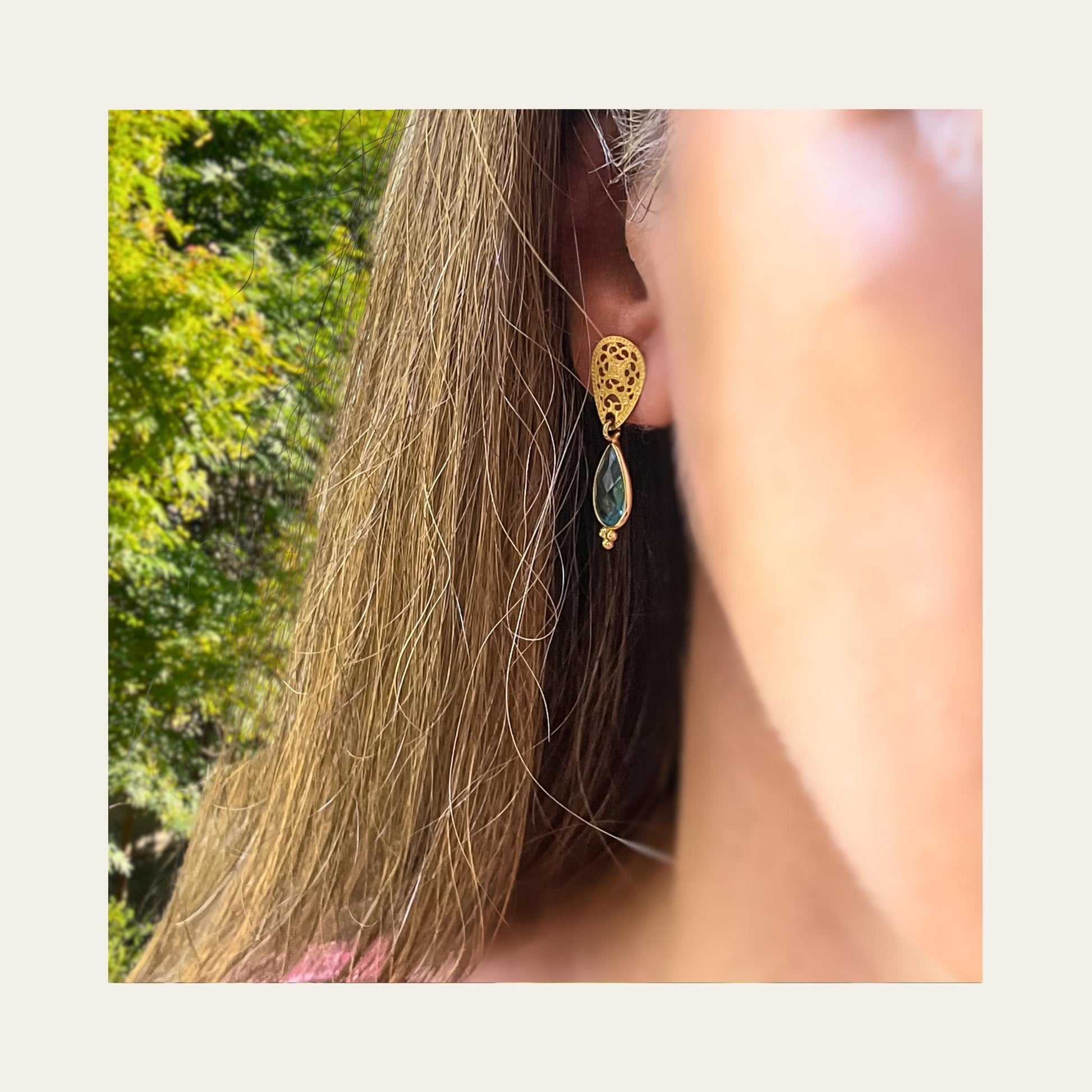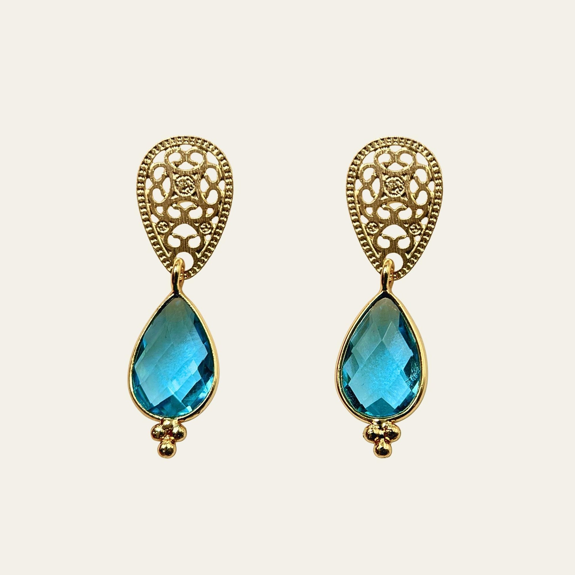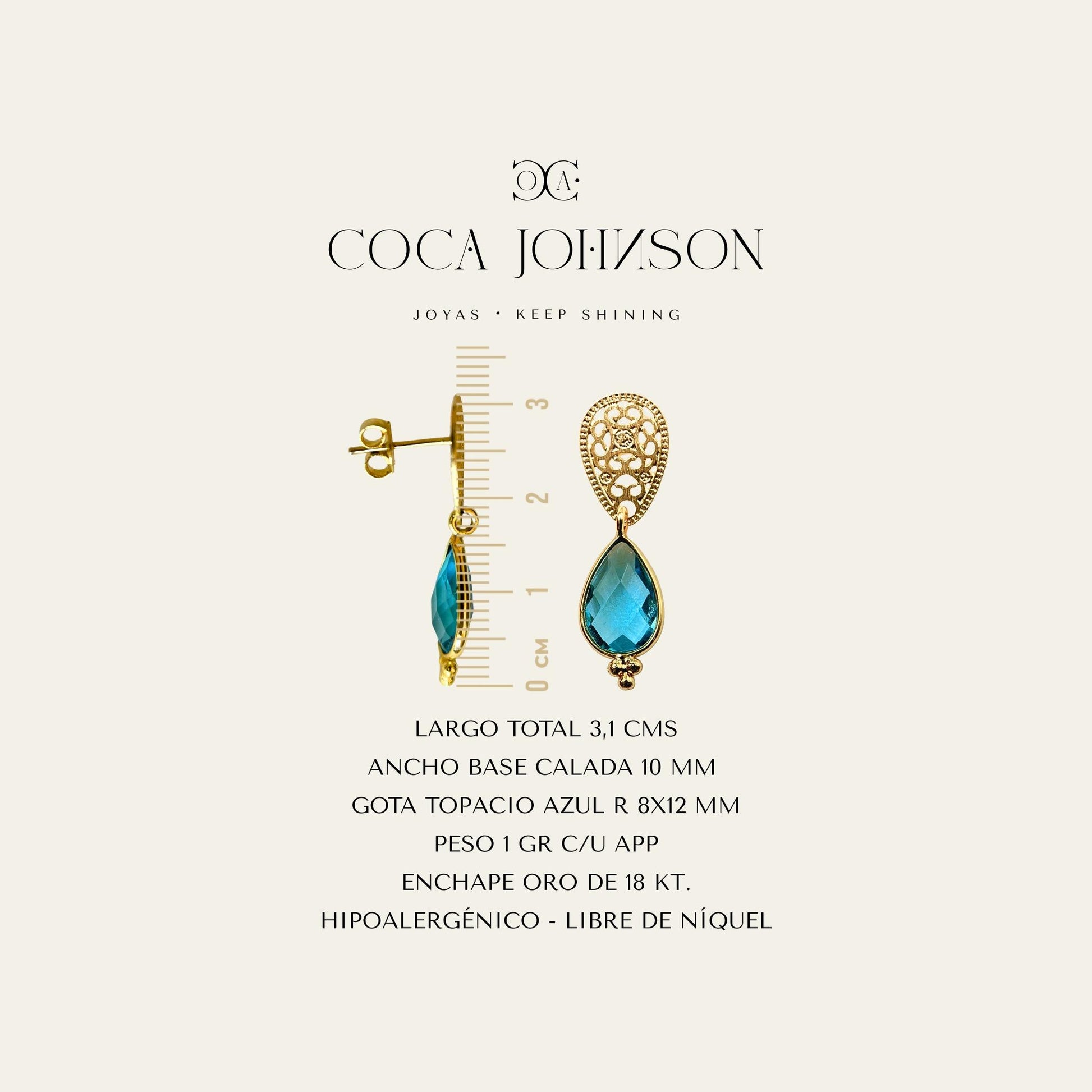 - Delicada base satinada con diseño calado y gota facetada de topacio azul suizo R de 8X12 mm, captura la luz con cada movimiento, aportando sofisticación y elegancia a tu estilo.
