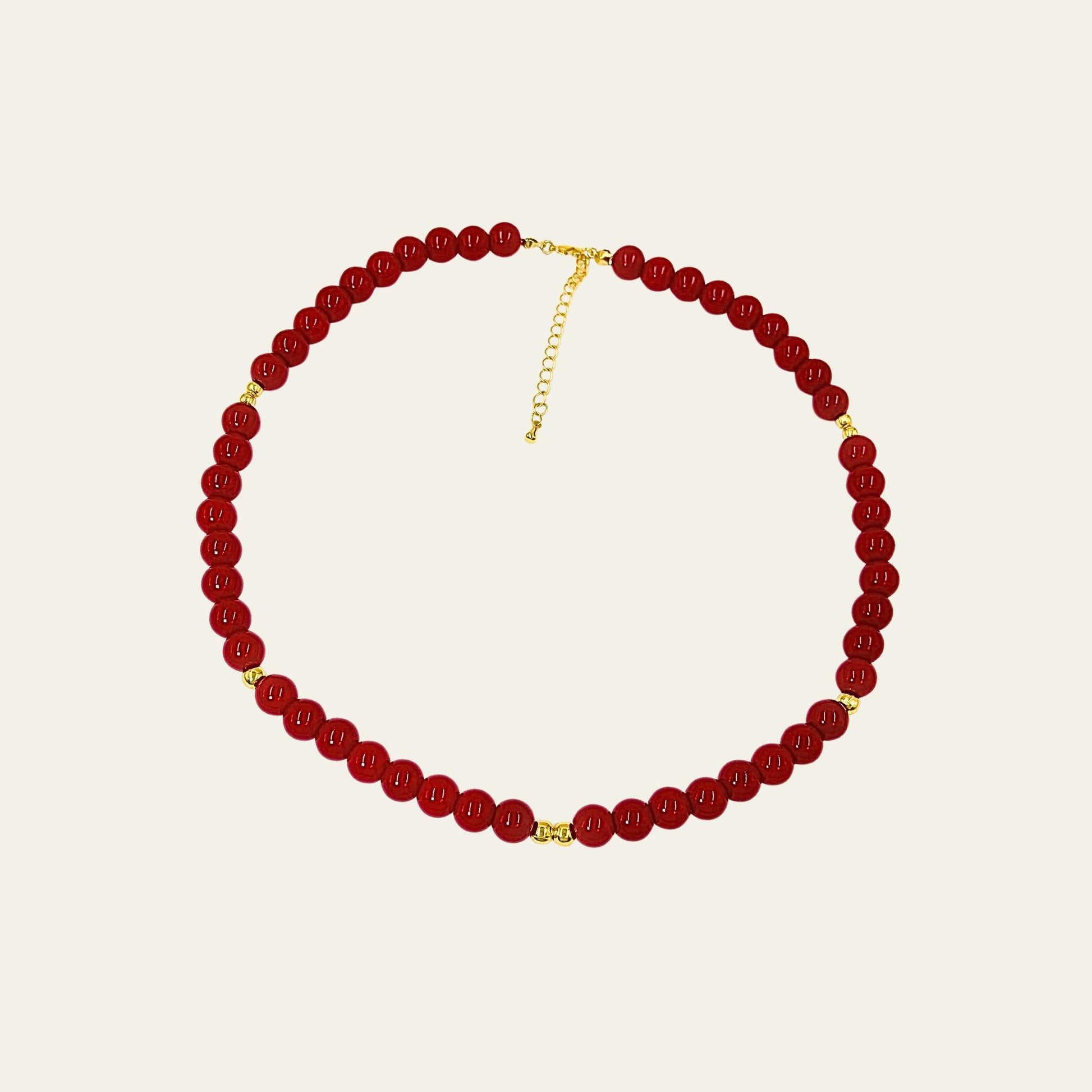 - Hecho con esferas de jade rojo R de 8 mm y detalles en oro enchapado de 18 Kt, este collar celebra la elegancia y la energía interior en perfecto equilibrio.