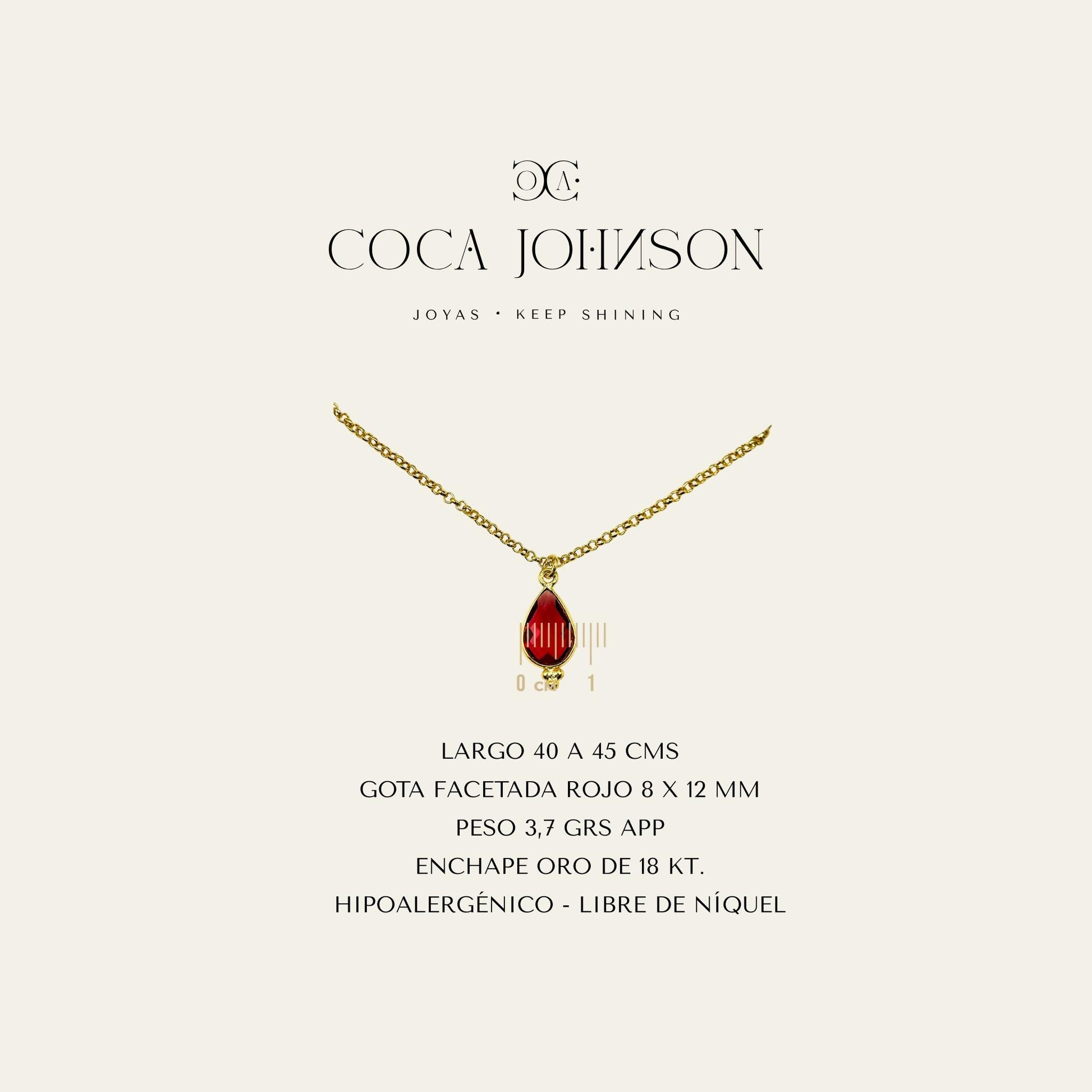 - El tono profundo de su gota roja facetada de 8x12 mm se mezcla con el brillo cálido del enchape de oro 18 Kt, creando un collar que transmite fuerza, brillo y elegancia en perfecto equilibrio.