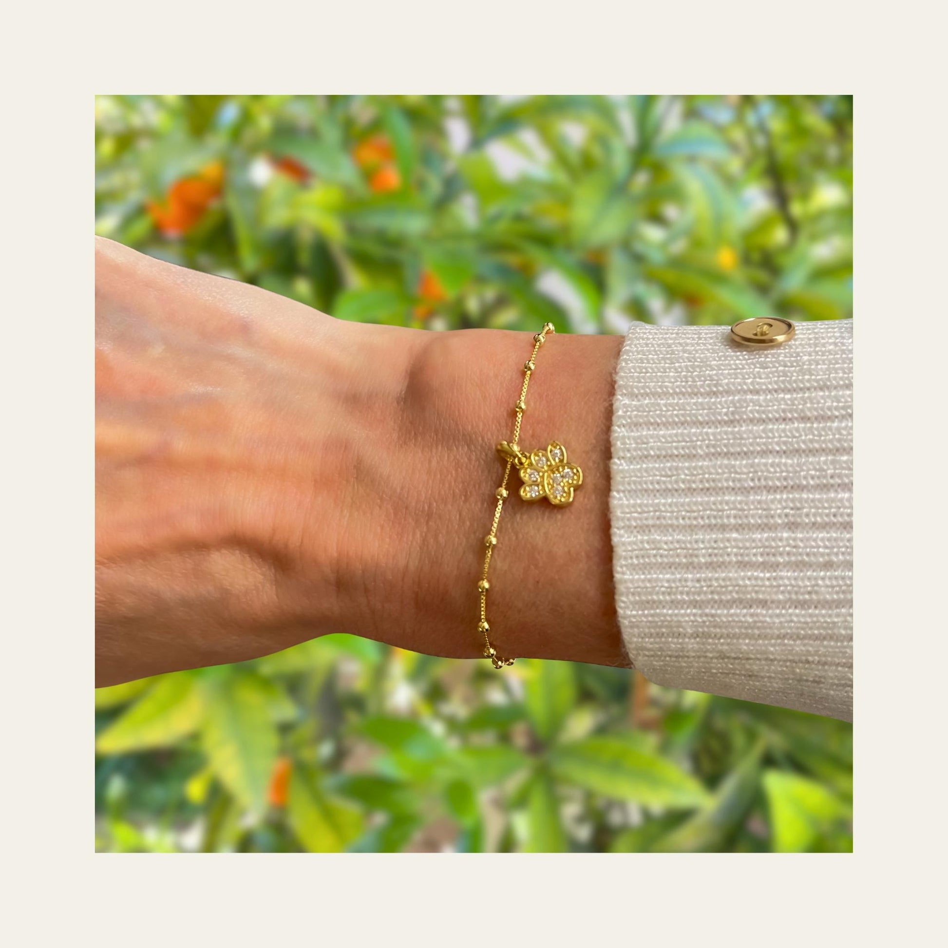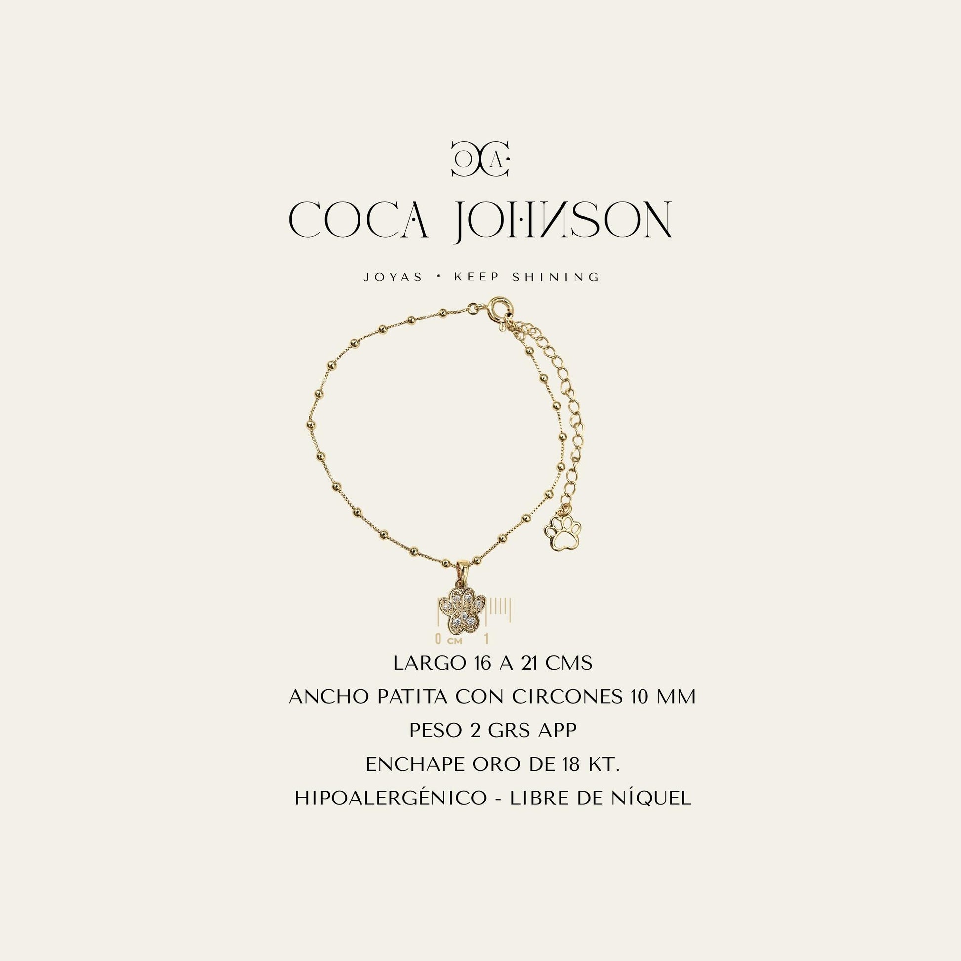 - Esta pulsera con patita de cachorro y mini circones sobre una cadenita con bolitas, la convierten en un diseño tierno y luminoso para tu día a día.